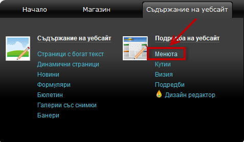 Отидете на меню Съдържание на уебсайт и кликнете на линк Менюта.![]() |