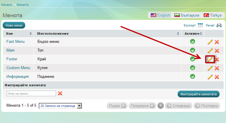 Промените в едно меню незабавно ще се отразят в уебсайта, при условие, че менюто има активен статус. |