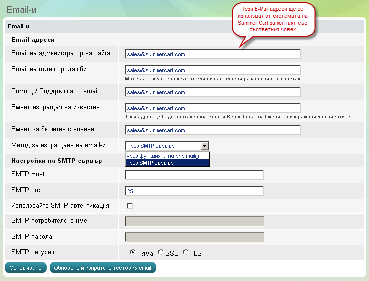На страницата 'Email- и' Вие можете да оставяте email адреси, които системата Summer Cart ще използва, за да праща автоматични съобщения до администратора на уебсайта, отговорното лице за поръчки и отговорното лице за помощ/поддръжка.