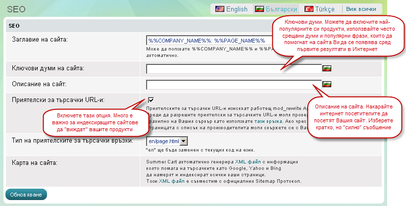 Използвайте страницата 'SEO', за да оптимизирате за търсачки Вашия уебсайт. Тук Вие можете да посочите ключови думи и описание на уебсайта на един или повече езици, и да активирате т.нар. „Приятелски-за-търсачки URL-и“ (search-engine-friendly URLs).