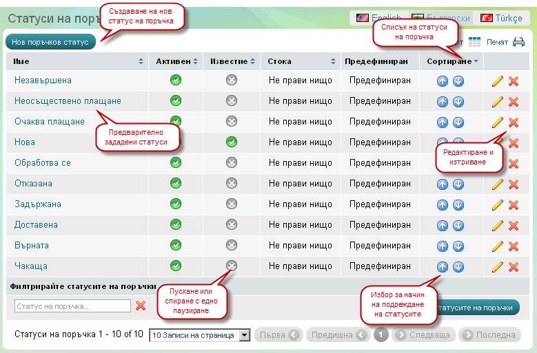 Използвайте страница 'Статуси на поръчка', за да управлявате предефинирани статуси на поръчка и да създавате Ваши специфични статуси, които подхождат най-добре на бизнес практика Ви. Има 10 предефинирани статуса, вградени в системата Summer Cart, които Вие можете да спирате и подновявате, но не можете да изтривате. Вие можете да създавате, изтривате, активирате и спирате колкото желаете нови статуса. Също така можете да ги подреждате в определен ред.