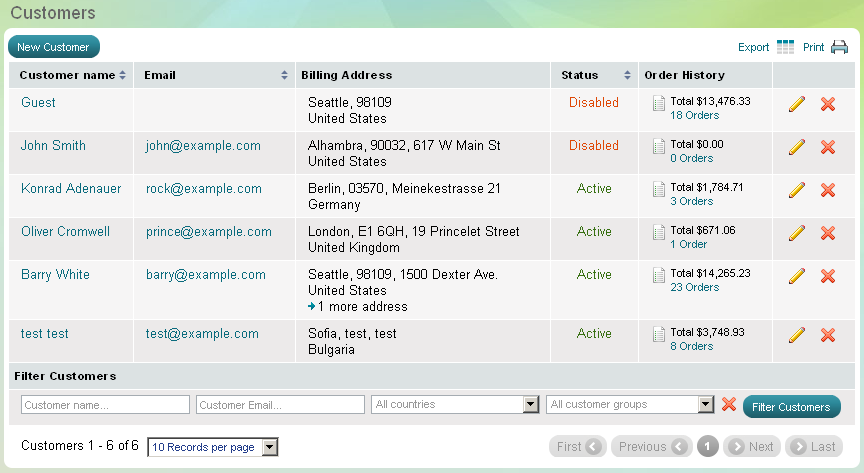 Whenever you receive an order from a new customer, the Summer Cart system creates a new customer account. In addition to this you can manually add new customers. You can easily view customers' order history in your store, edit registration details and delete customer accounts if necessary.