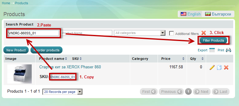 - A list of your store's products will appear. By using the Filter above it, you should only leave one product in the current selection. You can do that by copying a random product's SKU, pasting it in the filter's first field and then clicking "Filter Products"