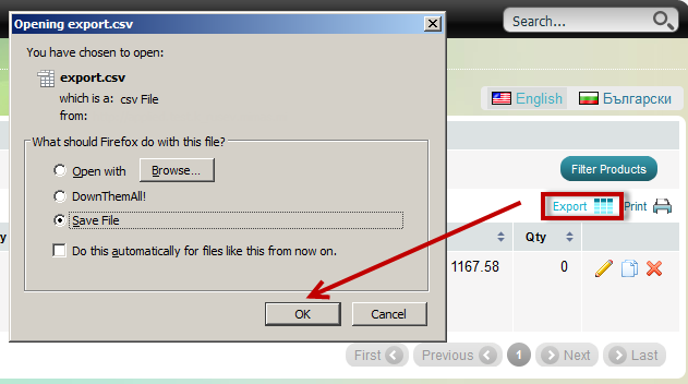 - Now you can do a product export. This operation will create a .csv file that you can use as a template. Click "Export" and a window is going to open, offering you to either open or download the file to your hard drive. Save it and then open it.
