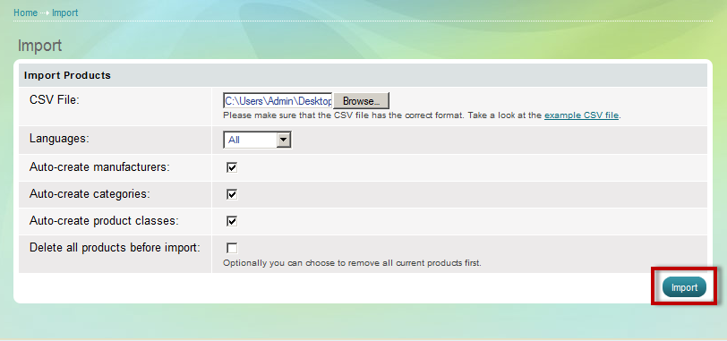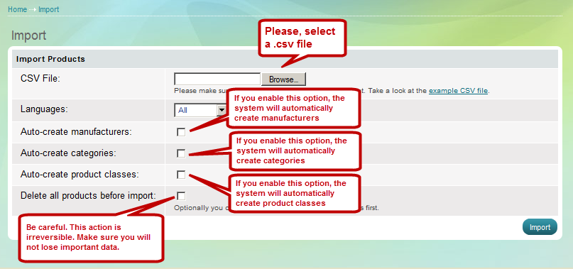 - "Delete all products before import" - this option is useful when you start a new store and you need to