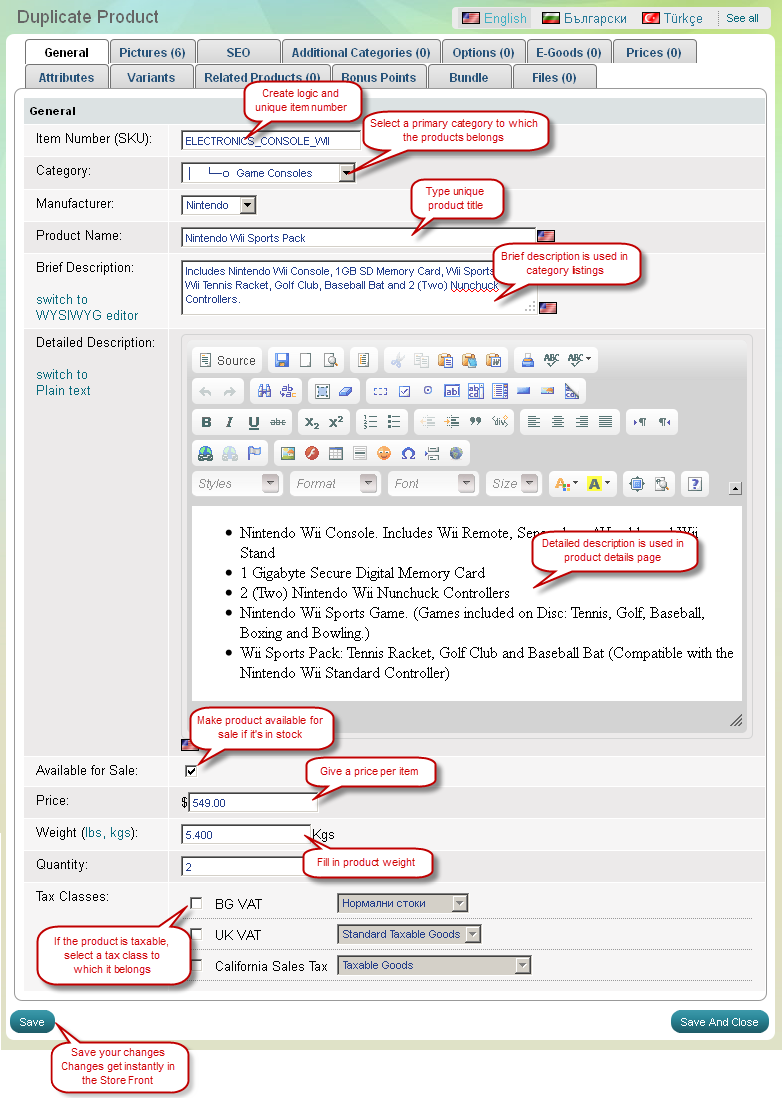Use General Tab to customize basic product information. Examine the original product information and make the necessary changes for the duplicate.