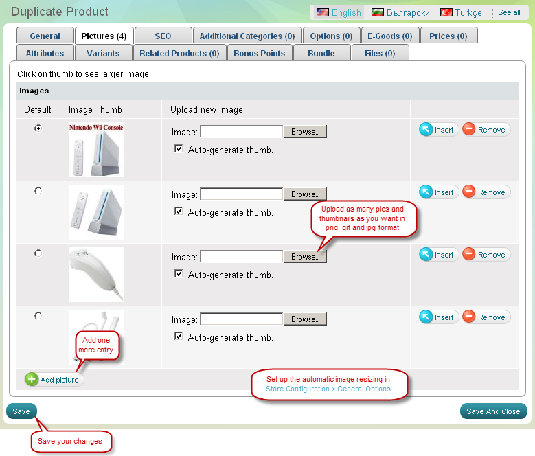 Use Pictures Tab to upload pictures and thumbnail images of the new product. To replace original product's pictures with new images just browse to find the new ones.