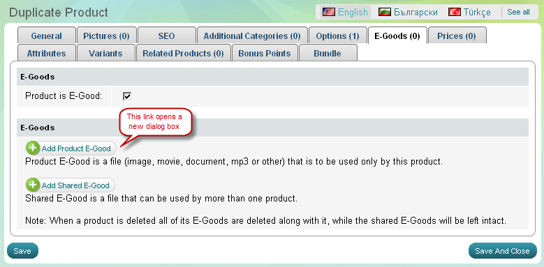 Use E-goods Tab if the duplicate product is intangible product like music, video, software, games, picture and so on. Activate the checkbox "Product is e-good" and start adding e-goods. More about e-goods