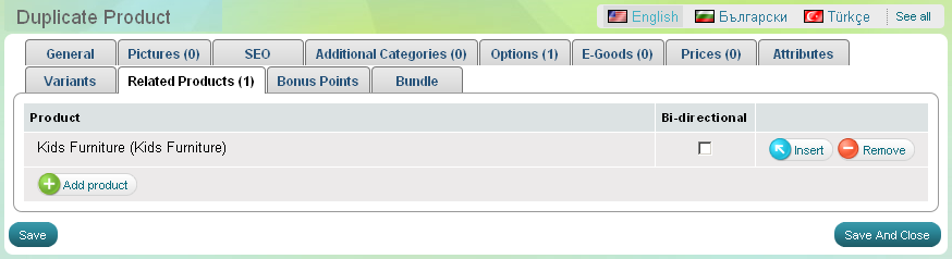 'Duplicate product' page is organized into 13 tabs to help you easily customize product details: 'General' tab, 'Pictures' tab, 'SEO' tab, 'Additional Categories' tab, 'Options' tab, 'E-goods' tab, 'Prices' tab, 'Attributes' tab, 'Variants' tab, 'Related Products' tab, 'Bonus Points' tab, "Bundle" tab.