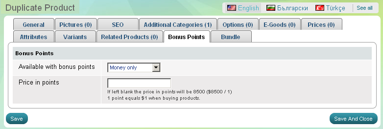 Use Bonus Points Tab to choose availability of the product with bonus points. You have three options - to buy the product with money only, points only or points and money.
