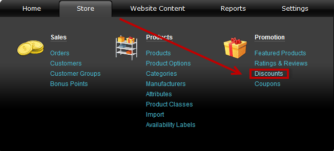 - Go to the Store menu, under 'Promotion' click on Discounts link. 'Discounts' page appears.