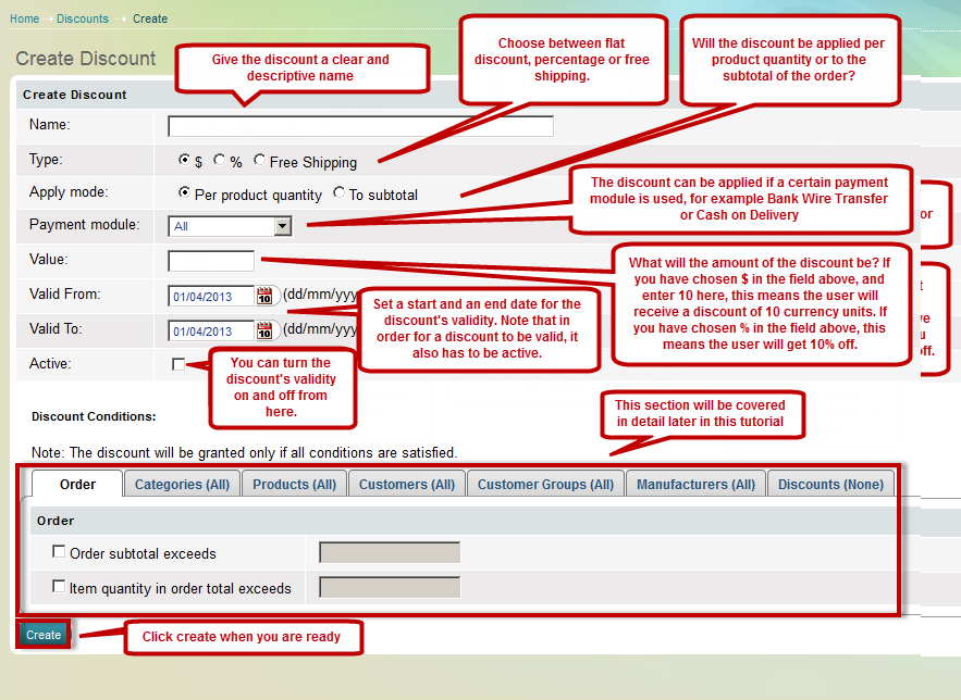 'Create Discount' page has Name, Type, Apply mode, Payment module, Value, Valid from, Valid to, and Active fields that are general discount information. At 'Create Discount' page also there are 6 tabs that help you to set up 6 discount conditions: Order tab, Categories tab, Products tab, Customers tab, Customer Groups tab and Manufacturers tab.
