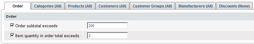 You can put one or more conditions on a discount offer with the use of Order tab, Categories tab, Products tab, Customers tab, Customer groups tab, Manufacturers tab and Discounts tab.