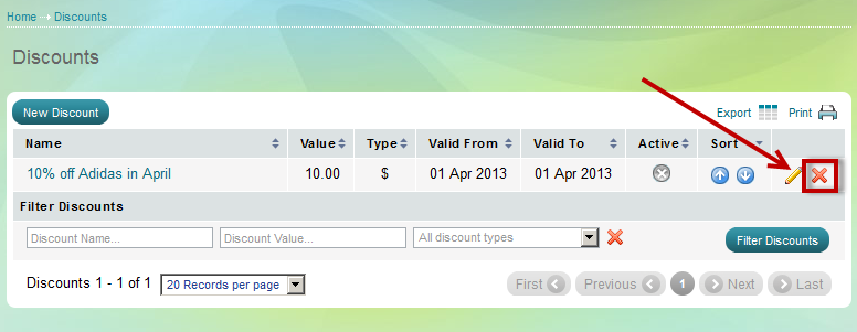 at the end of its row. Confirm you wish to delete that discount in a pop-up window.