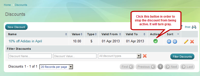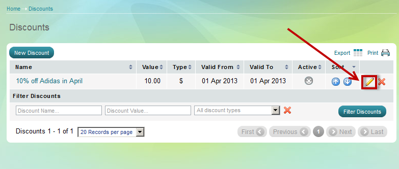 'Discounts' page appears. Find the discount you wish to delete using Filter options and click on