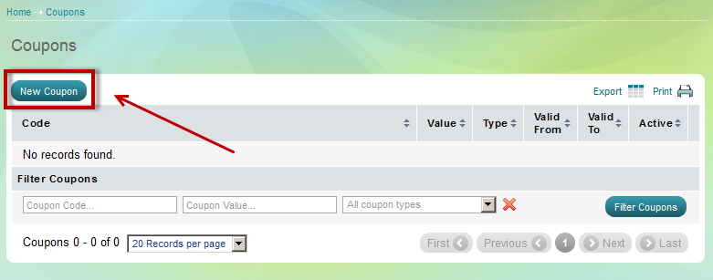 - Click on New Coupon button on top of page. 'Create Coupon' page appears.