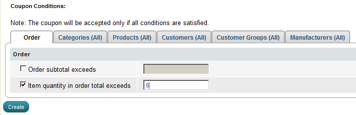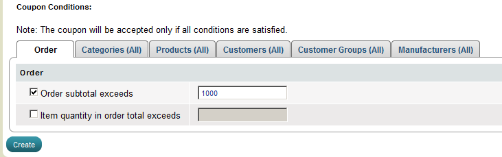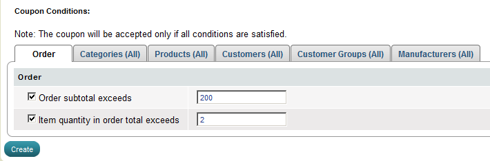 You can put one or more conditions on a coupon with the use of 6 tabs: Order tab, Categories tab, Products tab, Customers tab, Customer Groups tab and Manufacturers tab.