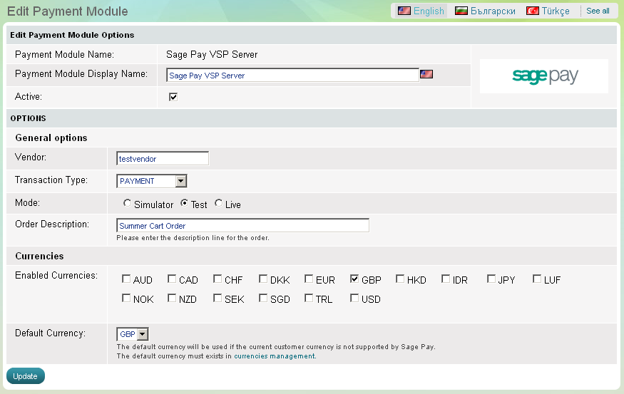 Summer Cart shopping cart has 3 embedded modules for credit card payments through Sage Pay payment gateway, which guarantee secure online transactions. Summer cart supports the 'VSP Form', 'VSP Server' and 'VSP Direct' integration methods for Sage Pay through separate modules.