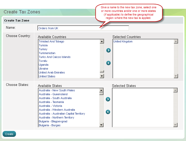 - Click on 'New tax zone' button in the middle of the page. 'Create Tax Zones' page opens.
