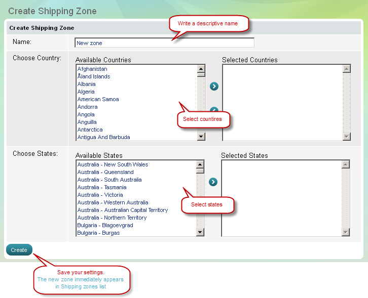 | Tip: | A new shipping zone will practically get into use only if you assign it to a shipping module at 'Shipping modules' page. |