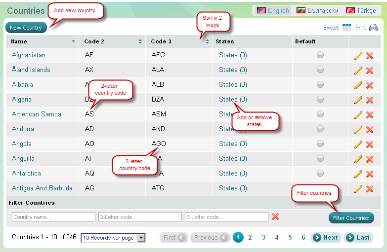 'Countries' page lists all countries of the world and can be customized according to your needs. Countries are a basic component in the setup of shipping and tax modules.