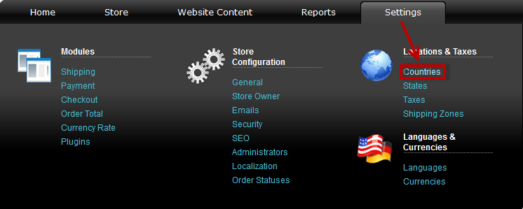 the Settings menu, under 'Locations & Taxes' click on Countries.
