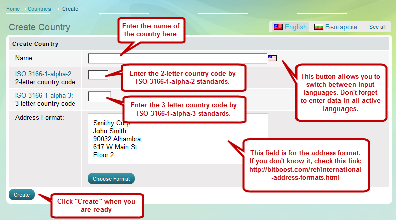 Address format - This field is for the address format. If you don't know it, check this link: http://bitboost.com/ref/international-address-formats.html