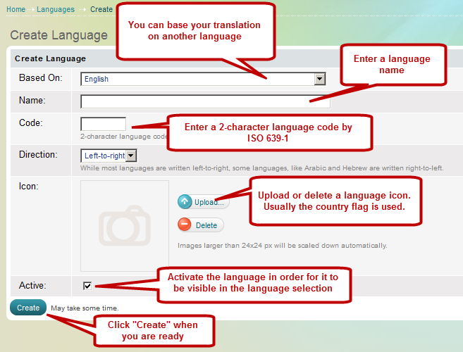 'Create language' page