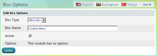 Go to the Website Content menu, under 'Website Layout' click on Boxes link.- Find the menu box and click on Options link at the end of the row. 'Box Options' page appears.