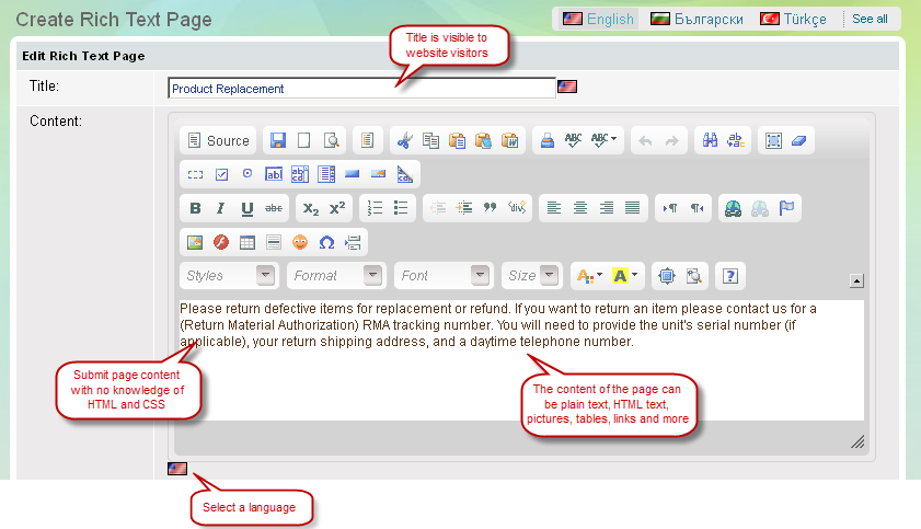 You can easily add text, graphics, tables and other visuals into a page with the help of 'What You See Is What You Get' editor link. Page content is supported in multiple languages. To add content in more than one language just click on the flag icon besides.