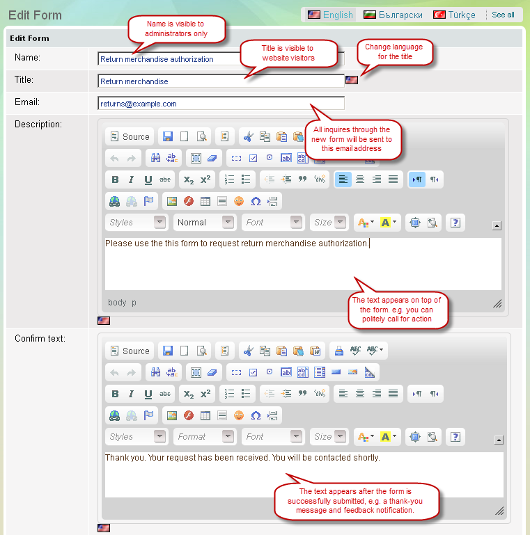 Name is used to identify a form in the Summer Cart admin panel and is visible to administrators only. Besides the name of a form, the store administrator defines a Title for the form which is visible to the public and can be displayed in multiple languages.