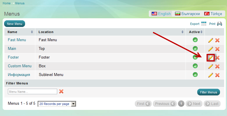 - Go to the Website Content menu, under 'Website Layout' click on Menus link. 'Menus' page appears.