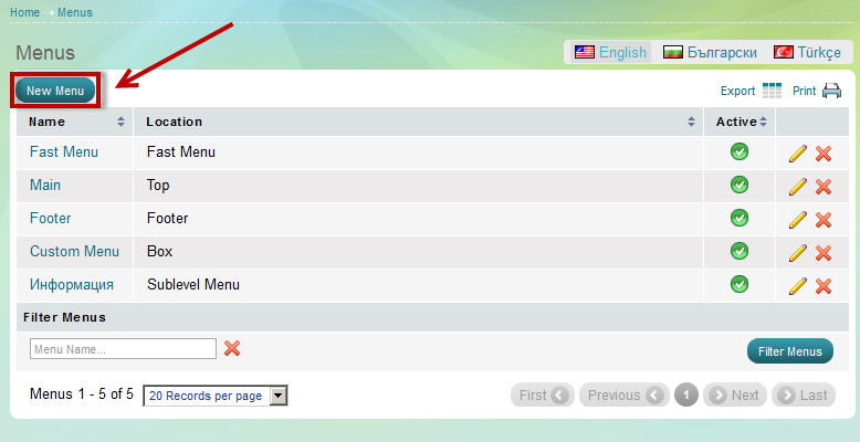 Remember to add items into a menu before activating it.A new menu will instantly appear on the website provided that it has an active status, even if it doesn't have contents to show. |