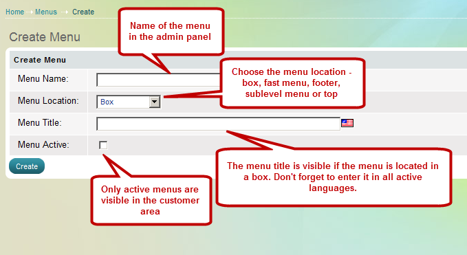 'Create menu' page