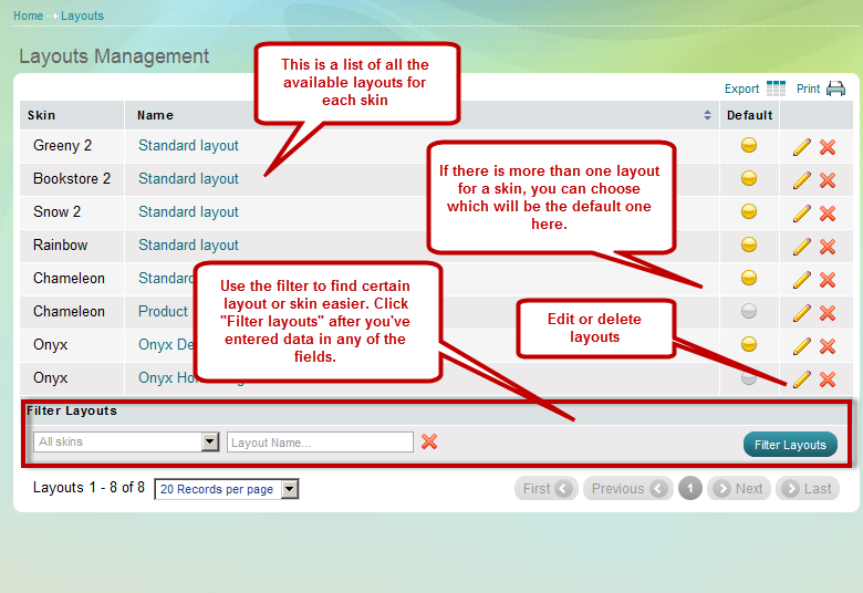 'Layouts' page helps you customize the layouts of the boxes. You can apply either one layout throughout the entire website or use multiple layouts and assign different layout to pages of your choice. For example, the layout of Home page may include 10 boxes, but the layout of 'Consumer Electronics' product category may consists of other 6 boxes, or be arranged in a different way.