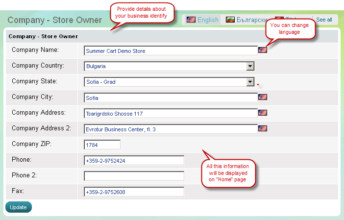 At 'Store Owner' page you can submit company details and contact information. If your store supports multiple languages, make sure you submit contact details in multiple languages using the Language Selection Bar.