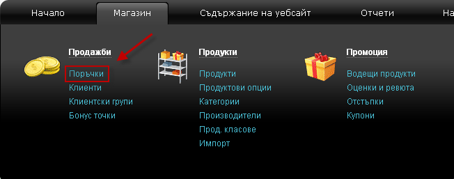- За да отворим дадена поръчка трябва да отидем в меню Магазин, след това в Поръчки.