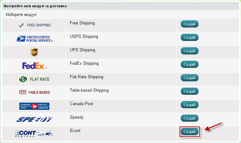 - На следващия екран натиснете бутона Създай срещу надписа Econt.
