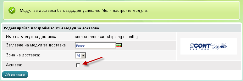- В зелен правоъгълник ще се покаже надпис - Модул за доставка бе създаден успешно. Натиснете в квадратчето срещу Активен: за да се покаже и останалата част от настройките на модула.