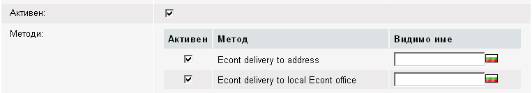 - На следващия ред ще видите надписа Методи: и под него списък с всички методи за доставка на Econt. От лявата страна на всеки от методите има квадратче. Ако го маркирате