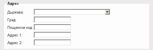 - Под надписа Адрес, както следва изберете Държава от списъка с падащото меню. Въведете Град, Пощенски код и Адрес 1. Можете да въведете и Адрес 2, но той не е задължителен.