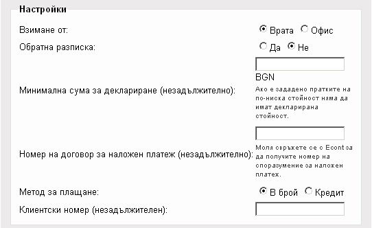 Метод за плащане: изберете по какъв начин ще плащате на Econt за услугите им. Ако изберете Кредит, трябва да въведете Клиентски номер.