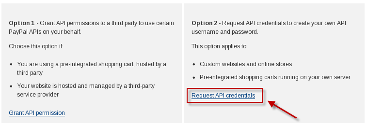 Натиснете върху връзката "Request API credentials" в кутията "Option 2"