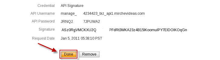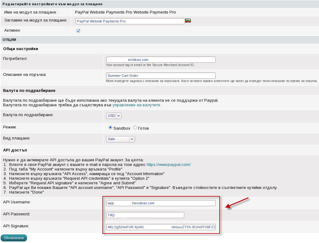 PayPal ще Ви покаже Вашите "API account username", "API Password" и "Signature". Въведете стойностите в съответните кутийки в "Опции" на модула (виж т. 9)