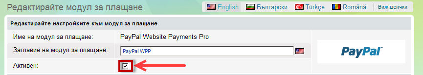 1. Активирайте модулa "PayPal Website Payments Pro" през административния панел на Summer Cart от меню "Настройки" - "Плащане".