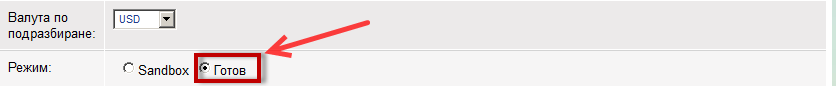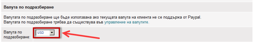 5. Изберете Вашата валута по подразбиране. Тя ще бъде използвана ако текущата валута на клиента не се поддържа от Paypal. Валутата по подразбиране трябва да съществува в управление на валутите.