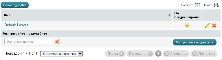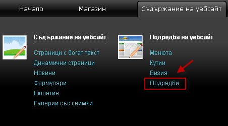 - Сега трябва да направите видима кутията в клиентската част. Отворете менюто Съдържание на уебсайт -> Подредби