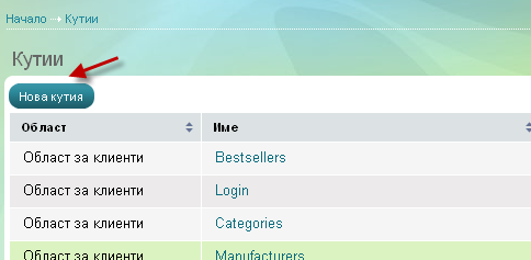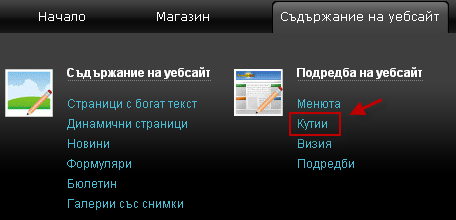 - Отидете в менюто Съдържание на уебсайт -> Кутии