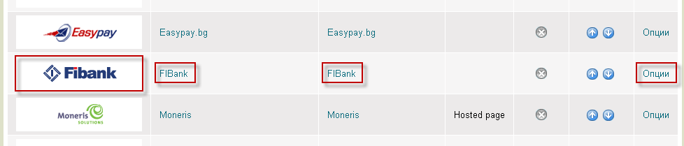 - От списъка с модули за плащане изберете FIBank, като натиснете върху логото на FIBank, самото име или върху Опции.