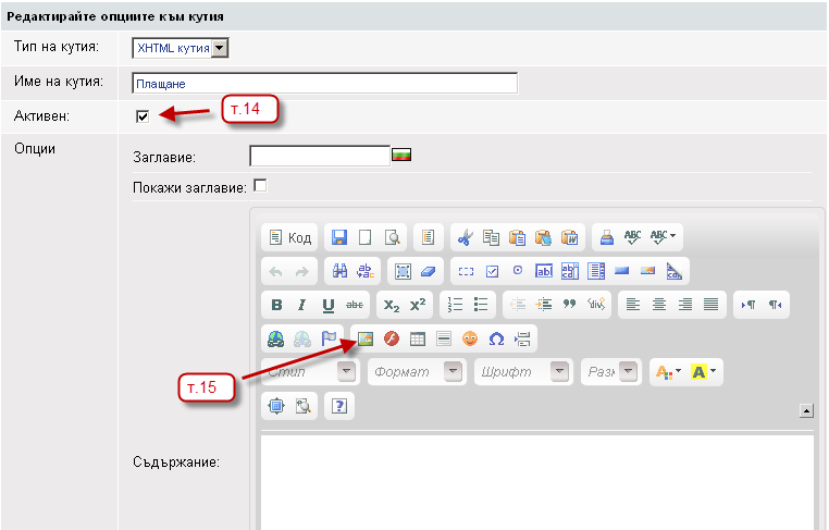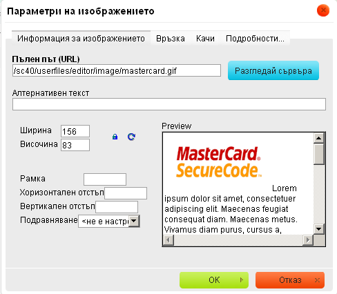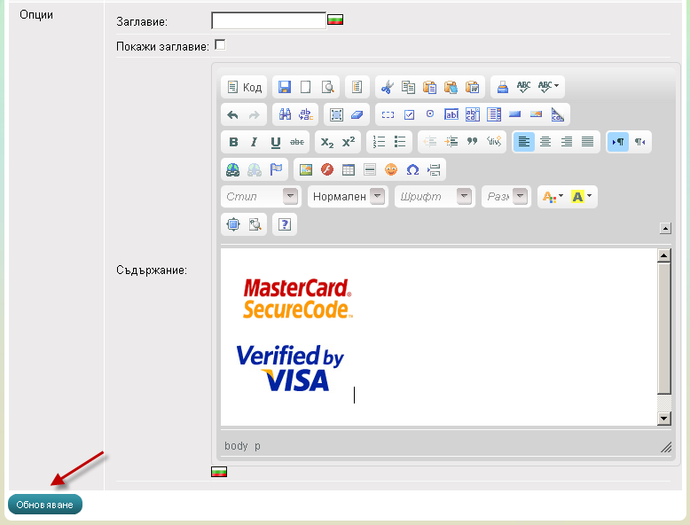- С помоща на XHTML редактора качете логата на VISA и MasterCard. За целта натиснете върху иконката - Изображение.